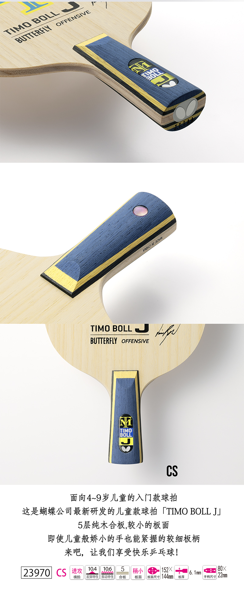 Butterfly蝴蝶23970 TIMO BOLL J-CS乒乓球純木底板重量輕,板面小 適合兒童的細型手柄