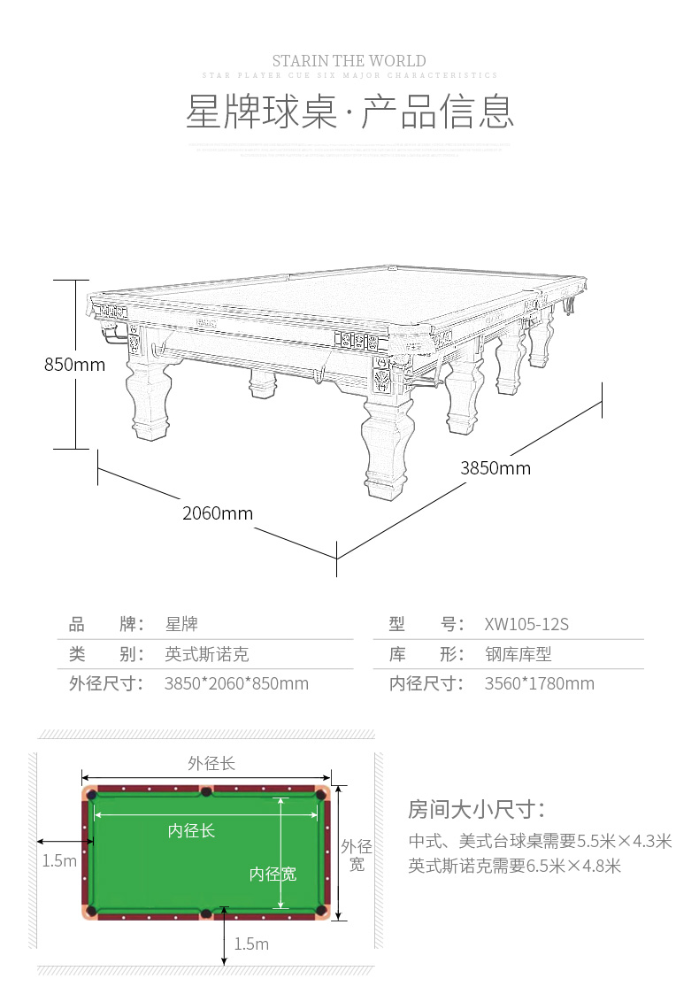 星牌 臺球桌 XW106-12S英式標準斯諾克俱樂部用臺